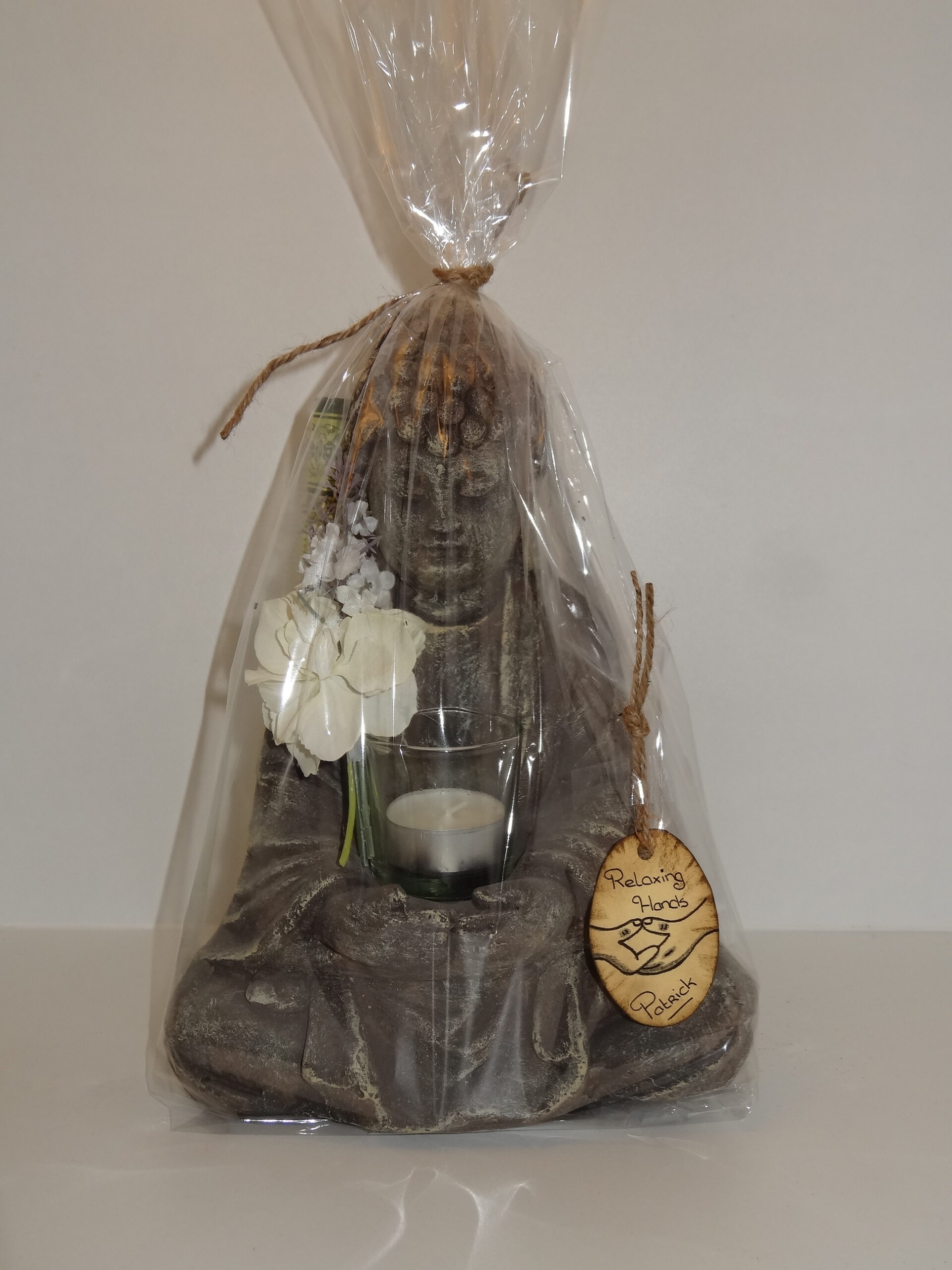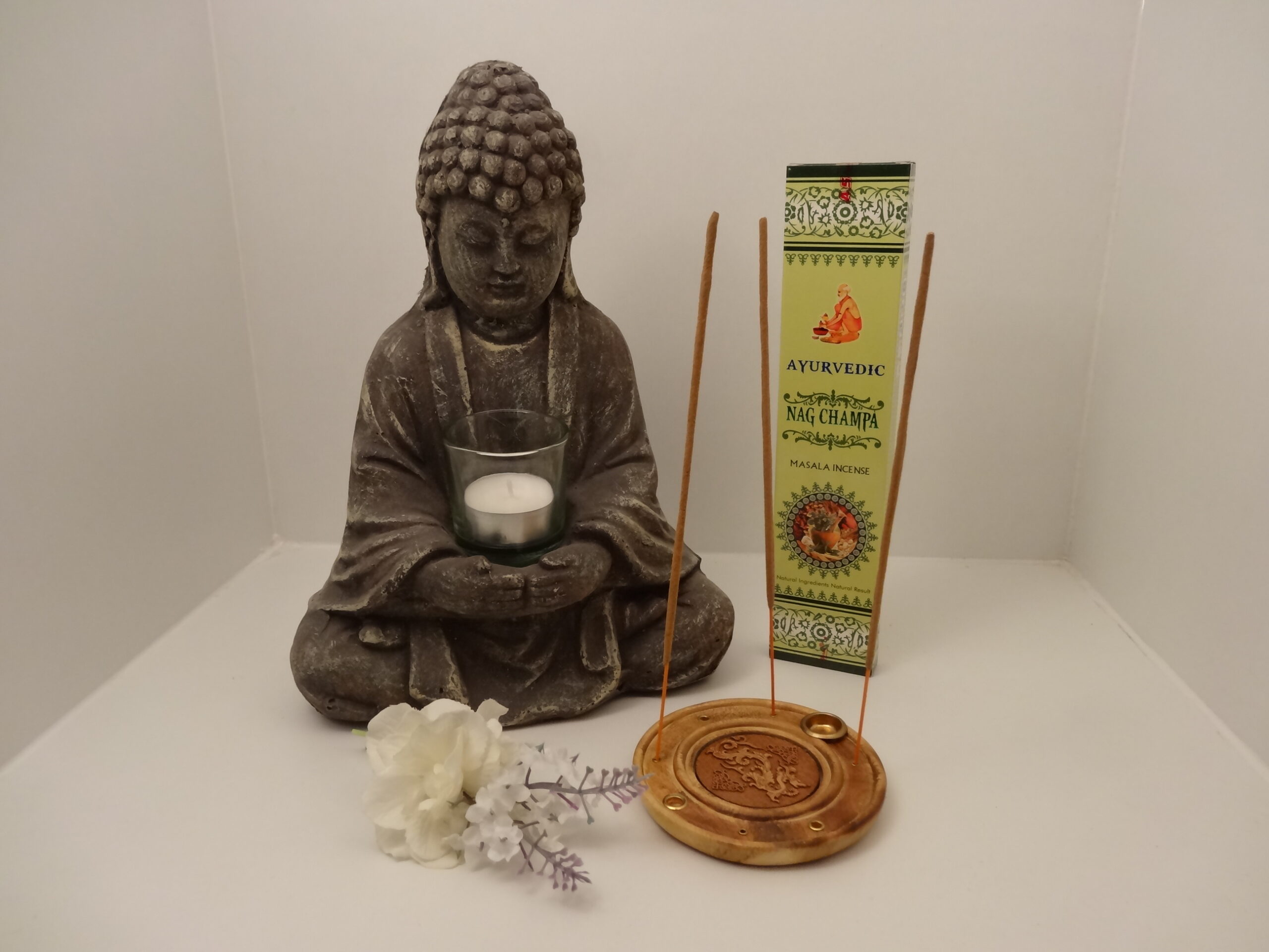 Grote Boeddha met kaarshouder, wierookhouder Draak en wierook Ayurvedic Nag Champa